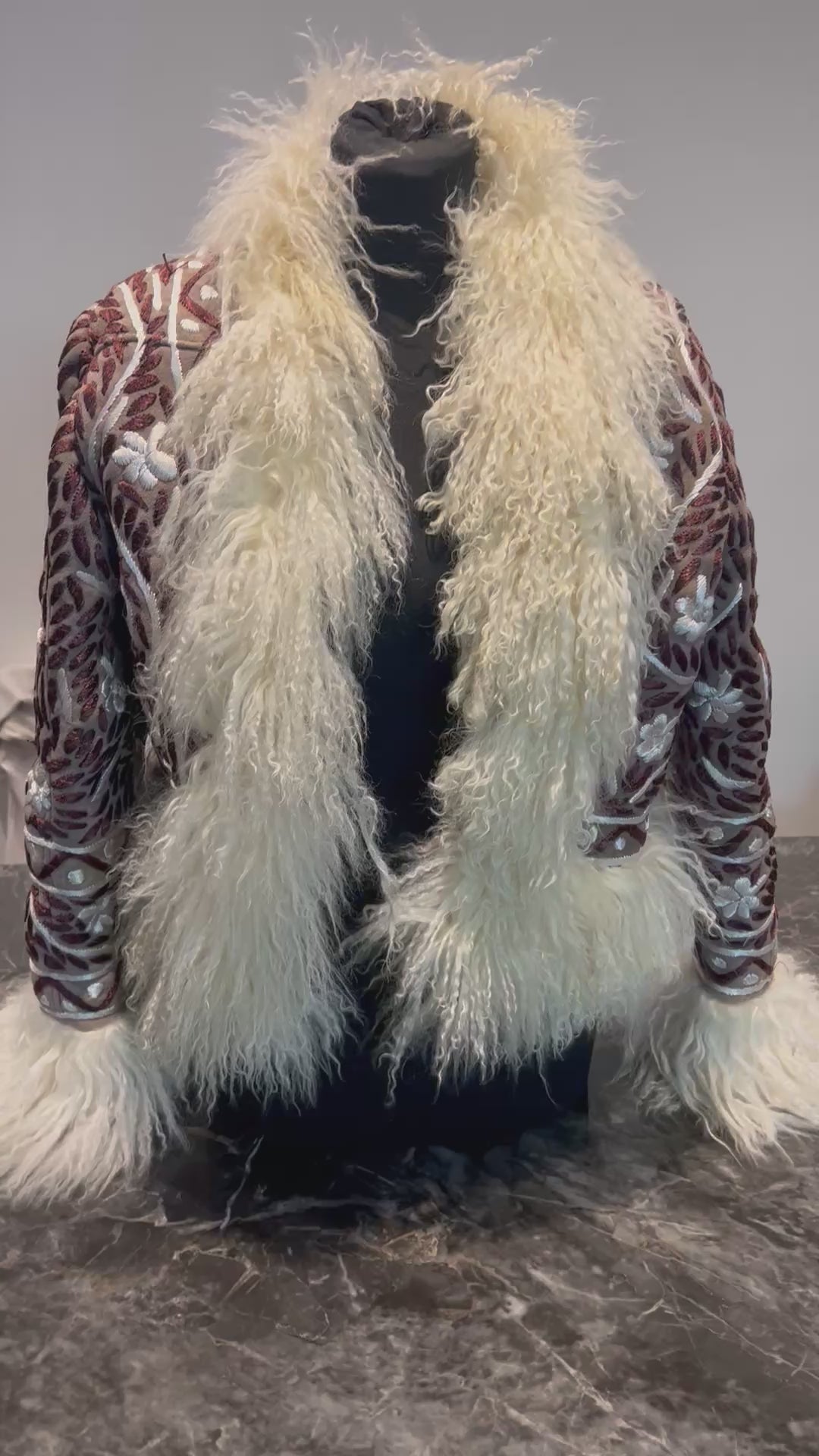 Framed with a dramatic Mongolian shearling in a soft ivory tone.